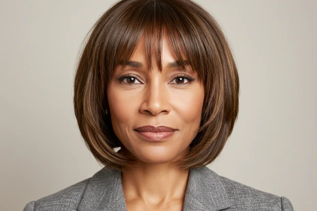 A timeless style featuring a softly layered bob that frames the face, paired with light, feathery bangs. The layers add movement, preventing the hair from appearing flat, making it ideal for fine hair.